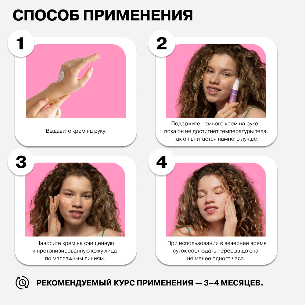 | Способ применения | наносить на очищенную, протонизированную кожу утром и/или вечером. Курс применения 3–4 месяца |