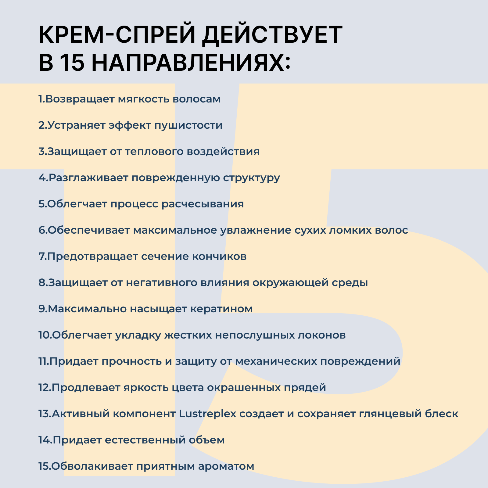 | Эффект | разглаживание / придание мягкости / облегчение расчесывания / придание объема / защита цвета / антистатик / питание / защита от негативного воздействия окружающей среды / укрепление / придание эластичности / придание блеска / увлажнение / восстановление |