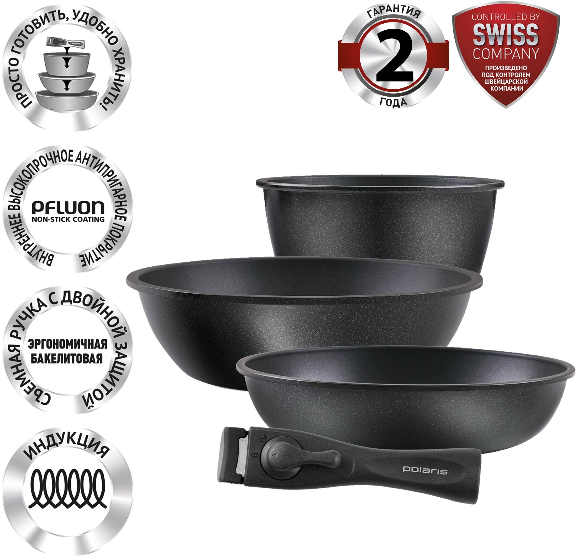 Давно мечтала о таком наборе ! Наконец приобрела и очень счастлива! Как всегда ,качество Polaris на высоте.Набор занимает очень мало места на полке,экономя пространство,что для меня очень важно!!! Пробовала запекать в духовке,сковорода не потеряла форму,ничего не пригорело! Восторг! Мыла в посудомойке, всё отлично!