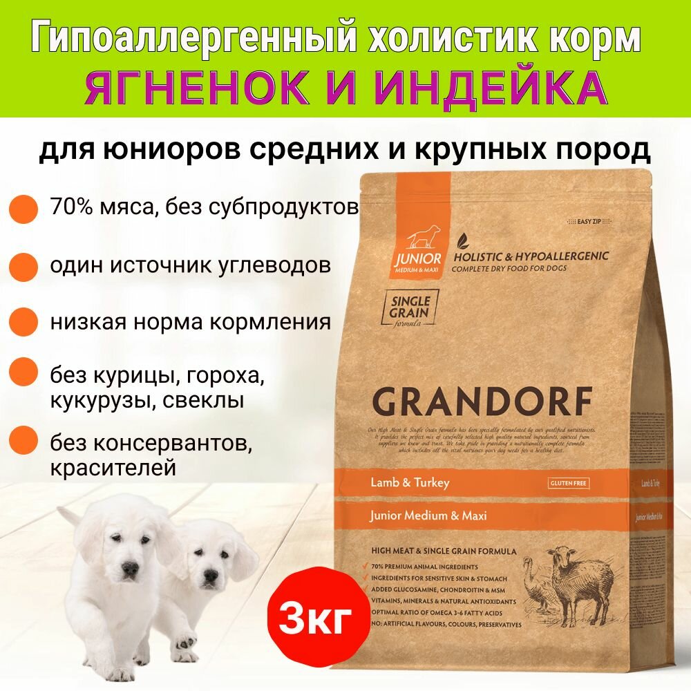 Сухой корм для собак GRANDORF Lamb and Turkey Junior Medium and Maxi юниоров от 4 месяцев, беременных и кормящих сук средних и крупных пород Ягненок с индейкой 3 кг