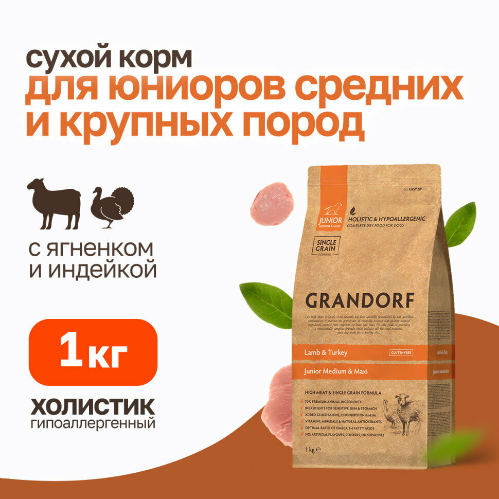 Сухой корм GRANDORF DOG Lamb&Turkey JUNIOR для щенков и юниоров с 4 до 12 месяцев, ягнёнок с индейкой, 1 кг.