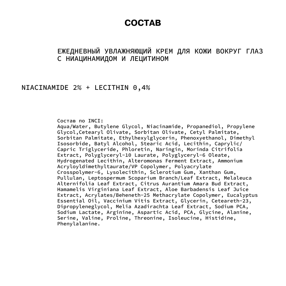 | Состав | Aqua/Water, Butylene Glycol, Niacinamide, Propanediol, Propylene Glycol,Cetearyl Olivate, Sorbitan Olivate, Cetyl Palmitate, Sorbitan Palmitate, Ethylhexylglycerin, Phenoxyethanol, Dimethyl Isosorbide, Batyl Alcohol, Stearic Acid, Lecithin, Caprylic/Capric Triglyceride, Phloretin, Naringin, Morinda Citrifolia Extract, Polyglyceryl-10 Laurate, Polyglyceryl-6 Oleate, Hydrogenated Lecithin, Alteromonas Ferment Extract, Ammonium Acryloyldimethyltaurate/VP Copolymer, Polyacrylate Crosspolymer-6, Lysolecithin, Sclerotium Gum, Xanthan Gum, Pullulan, Leptospermum Scoparium Branch/Leaf Extract, Melaleuca Alternifolia Leaf Extract, Citrus Aurantium Amara Bud Extract, Hamamelis Virginiana Leaf Extract, Aloe Barbadensis Leaf Juice Extract, Acrylates/Beheneth-25 Methacrylate Copolymer, Eucalyptus Essential Oil, Vaccinium Vitis Extract, Glycerin, Ceteareth-23, Dipropyleneglycol, Melia Azadirachta Leaf Extract, Sodium PCA, Sodium Lactate, Arginine, Aspartic Acid, PCA, Glycine, Alanine, Serine, Valine, Proline, Threonine, Isoleucine, Histidine, Phenylalanine. |