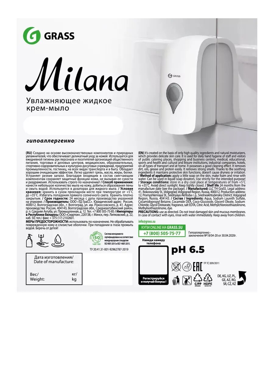 Мыло жидкое увлажняющее гипоалергенное Grass Milana жвачка 5л для рук тела кожи уход за руками, крем мыло