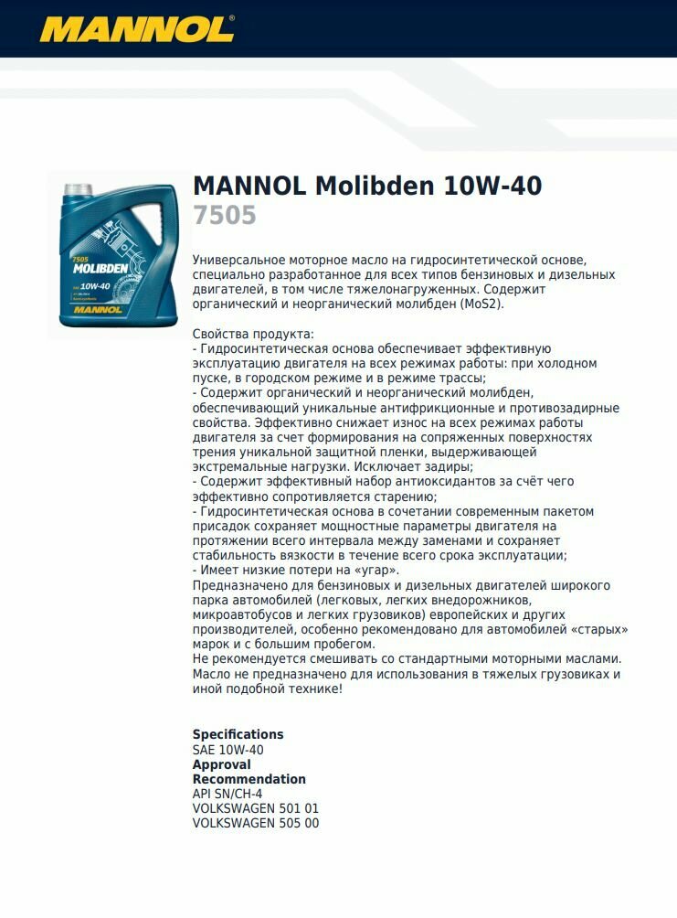 | Отзыв: | Отличное масло,не дорогое масло. Что такое молибден советую прочитать на офф.сайте Mannol. Менял его на 6-7 тыс. Когда обычное на 8-10тыс. В зависимости от езды. Если чаще городской режим, то по чаще, загородный трасса, то реже. |