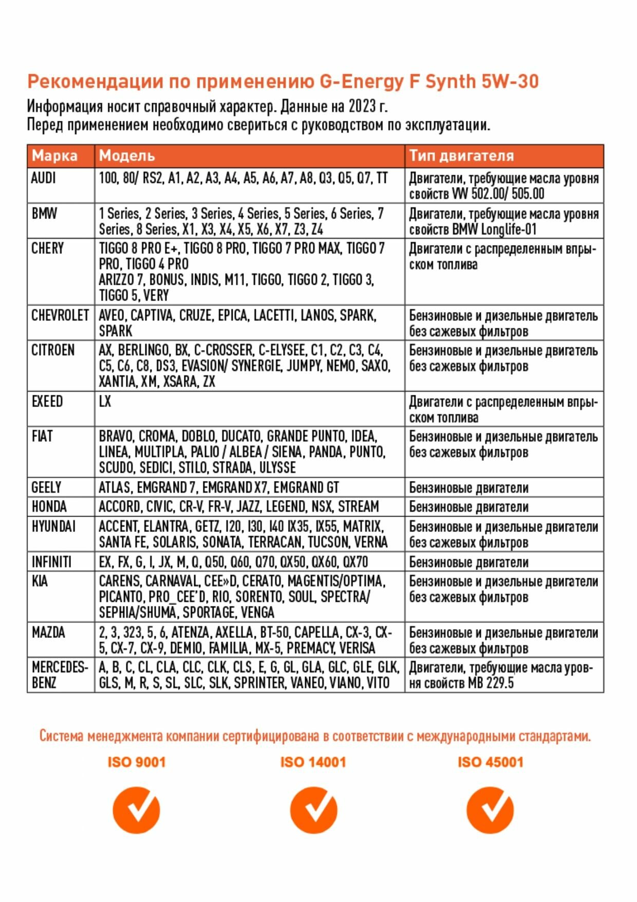 | Допуски OEM | VW 505.00 / VW 502.00 / BMW Longlife-01 / Renault RN 0700 / GM-LL-A-025 / GM-LL-B-025 / MB 229.5 |