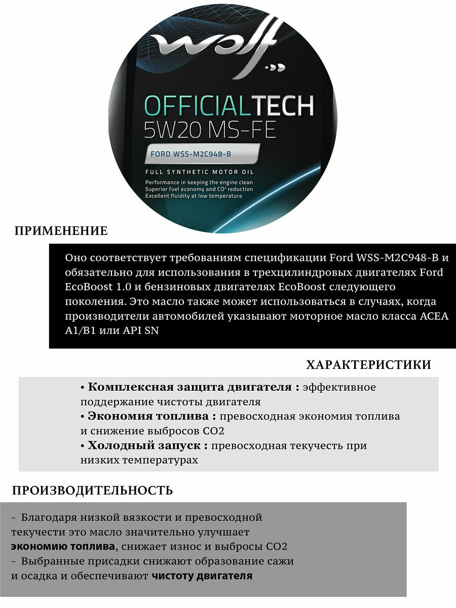 Масло моторное WOLF OFFICIALTECH 5W20 MS-FE 1L FORD WSS-M2C948-B ACEA A1/B1-12 API SN 8329975