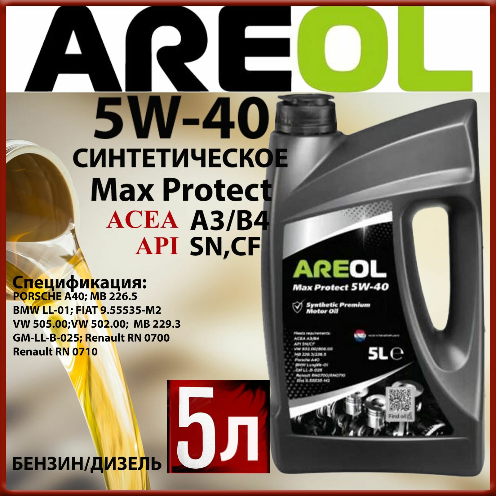 Купить areol max protect 5w40 (5l) масло моторное! синт.\ acea a3/b4, api sn/cf, vw 502.00/505.00, mb 229.3