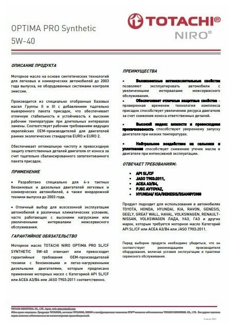 TOTACHI Totachi Niro Optima Pro 5W40 (4L)_Масло Моторн.! Синтapi Sl/Cf, Acea A3/B4, Jaso T903 2011