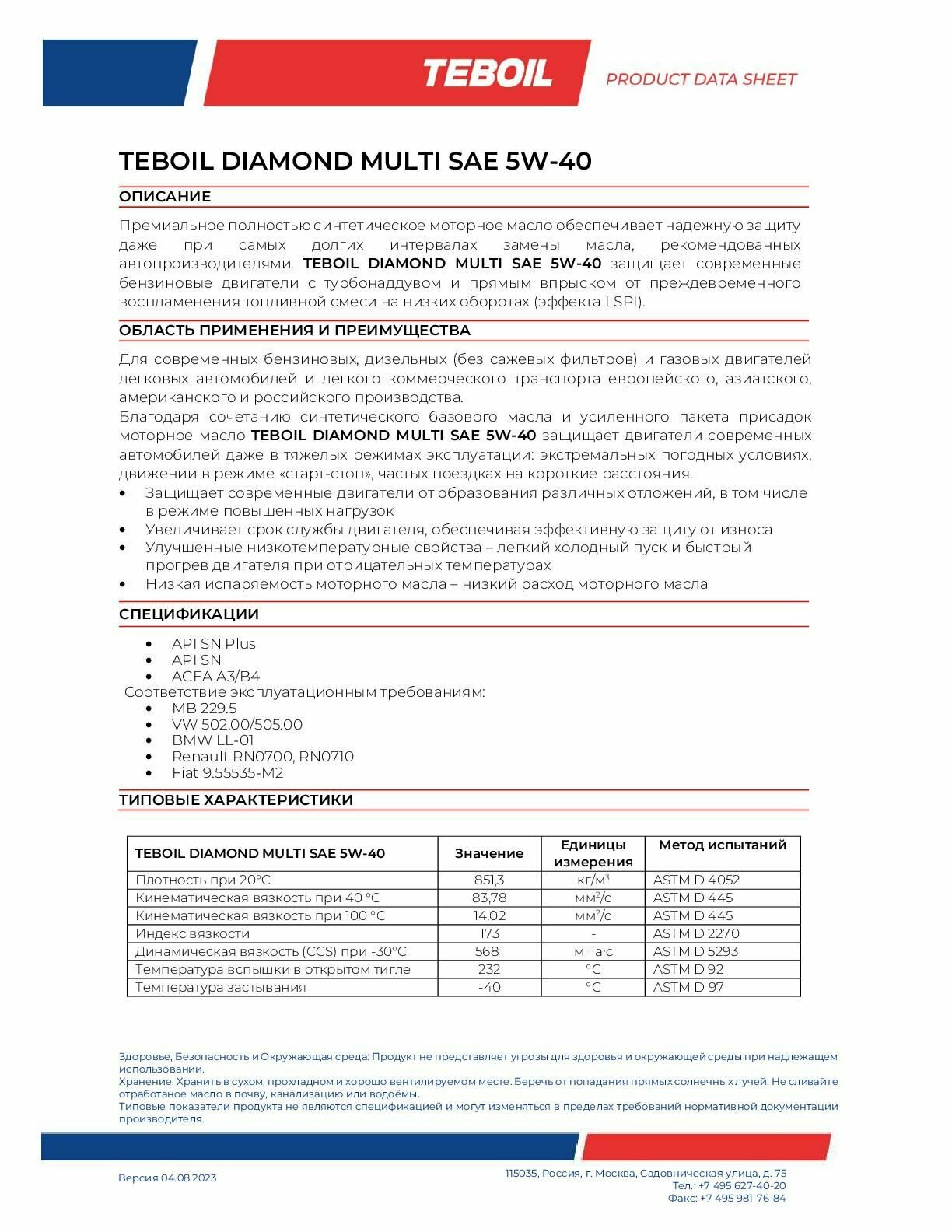 Teboil Рњр°Сѓр»Рѕ Рјрѕс‚Рѕсђрѕрѕрµ Сѓрёрѕс‚Рµс‚Рёс‡Рµсѓрєрѕрµ "Diamond Multi 5W-40", 4Р»