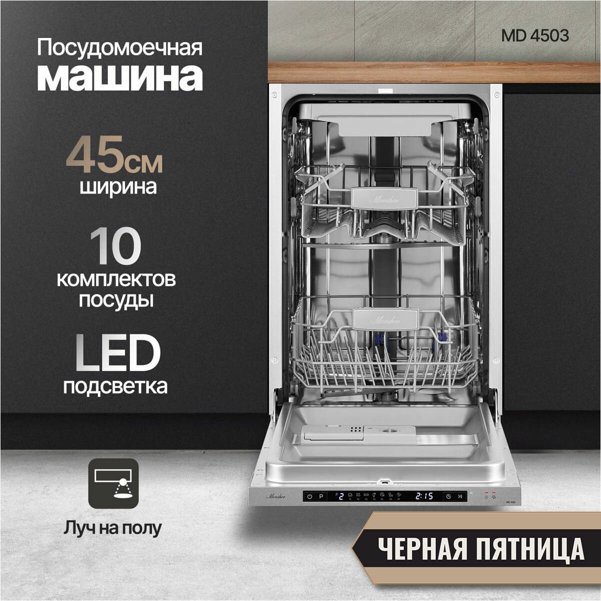 Встраиваемая посудомоечная машина Monsher MD 4503, луч на полу (Модификация 2024 года)