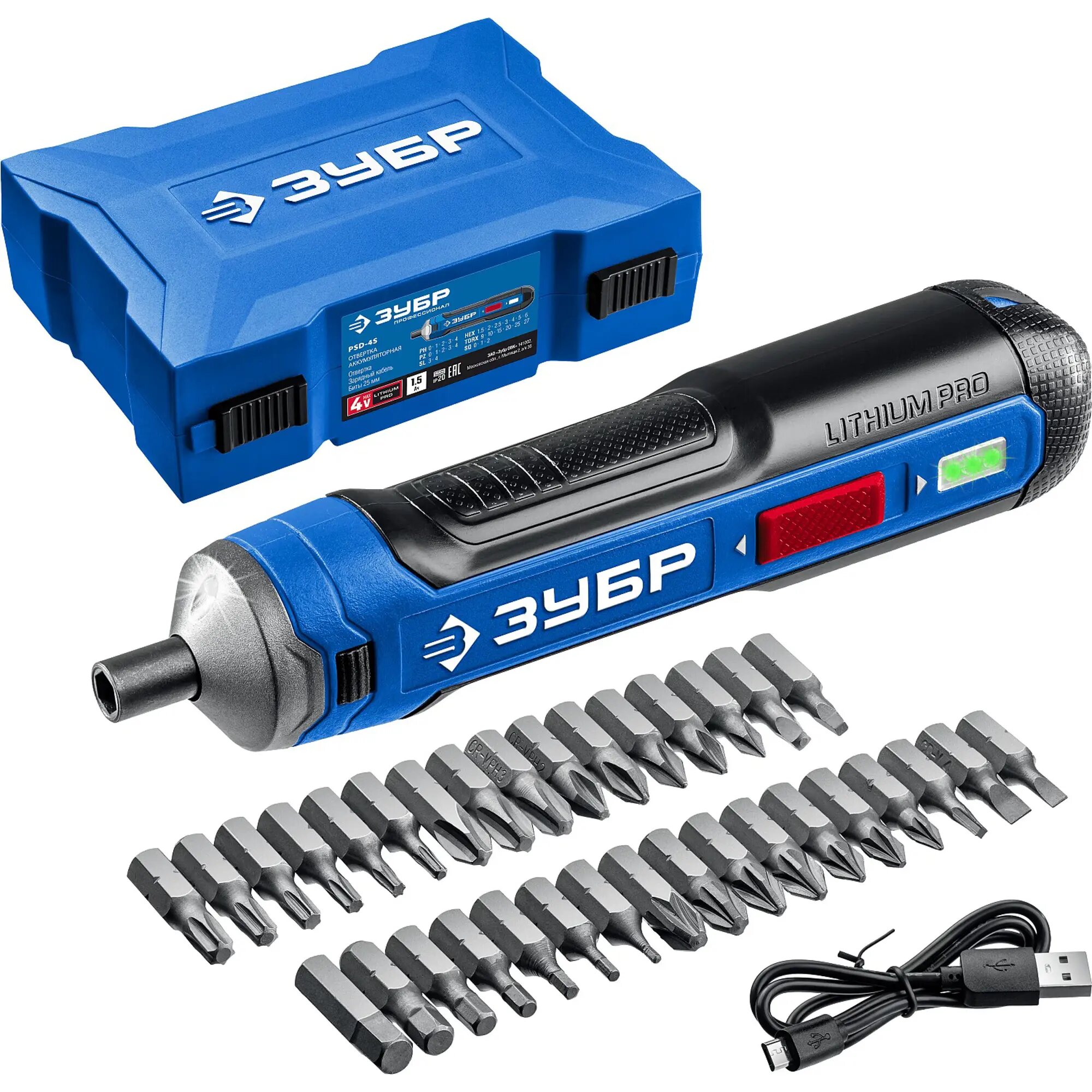 PSD-4S ЗУБР Аккумуляторная отвертка Профессионал 4 Vmax, в кейсе с набором 33 бит PSD-4S