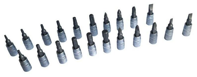 | Головки торцевые подробно | 1/4" (12-гр): 4, 4.5, 5, 5.5, 6, 7, 8, 9, 10, 11, 12, 13, 14 мм; с битами 1/4": H3, H4, H5, H6, H7, H8, T8, T10, T15, T20, T25, T30, T40, SL4, SL5.5, SL7, PH1, PH2, PH3, PZ1, PZ2, PZ3; трещетка 1/4": 24 зуба; вороток т-образный 1/4"; удлинитель 1/4": 50, 100 мм; гибкий удлинитель 1/4": 145 мм; карданный шарнир 1/4" |