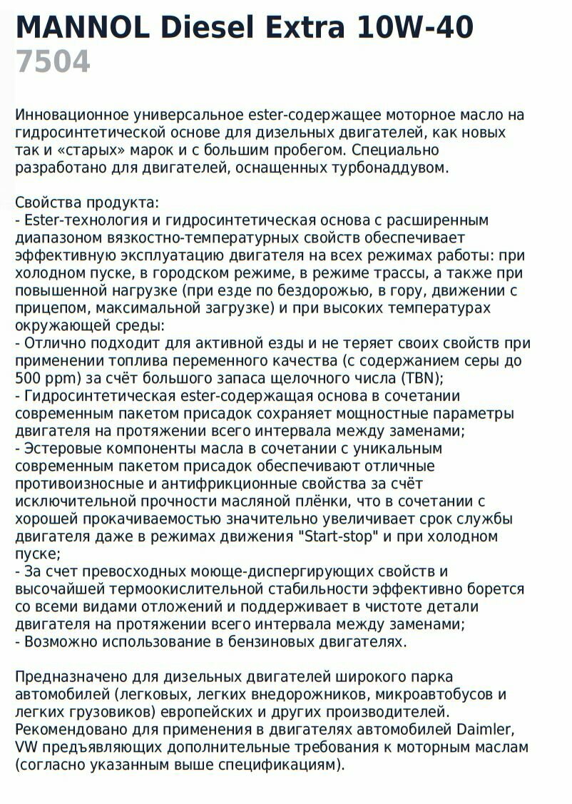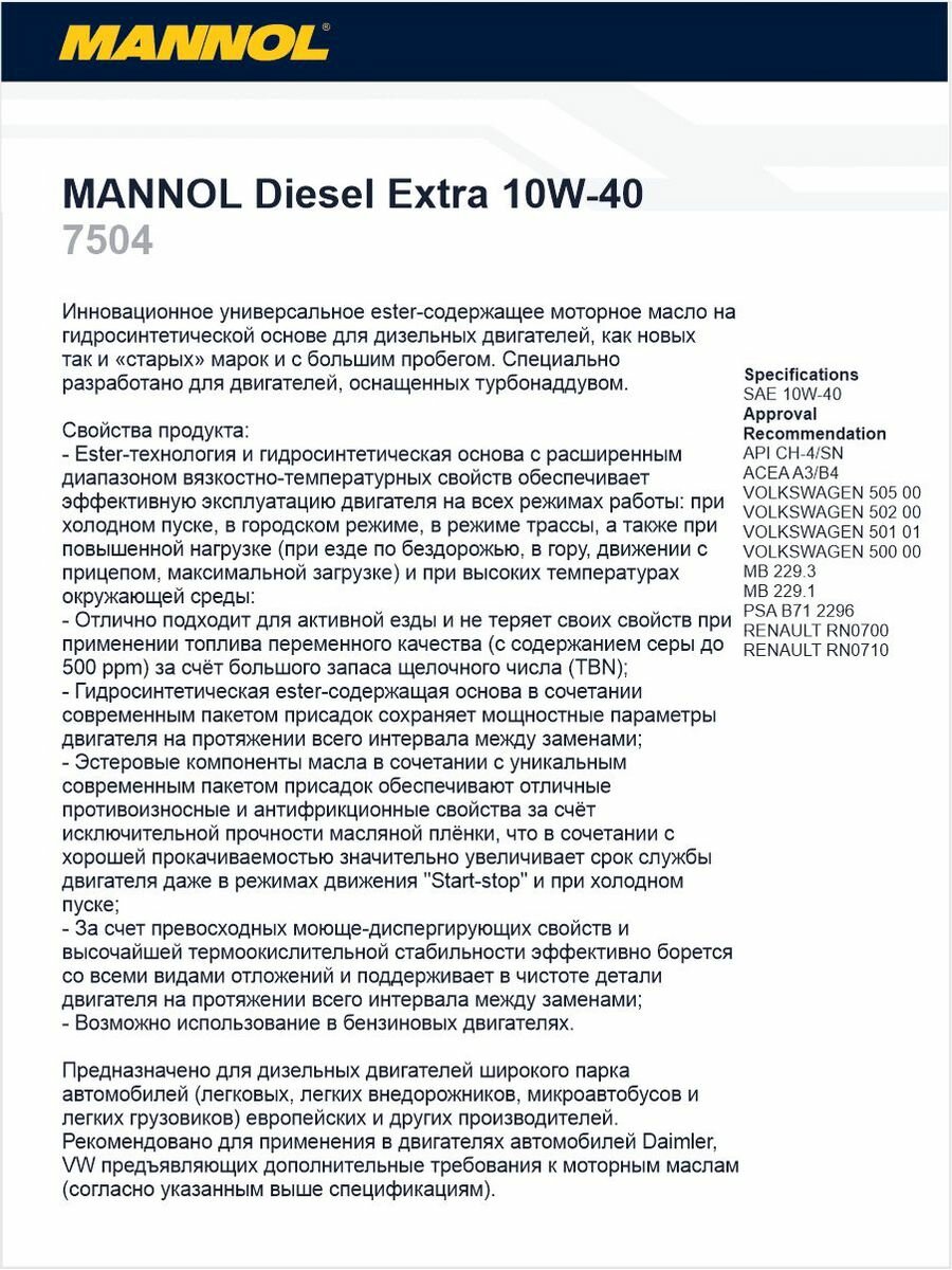 Масло Mannol Diesel Extra 10W40 п/синт. 7504 (7 л) API CH-4/SL, ACEA B4/A3, VW 505.0/502.00