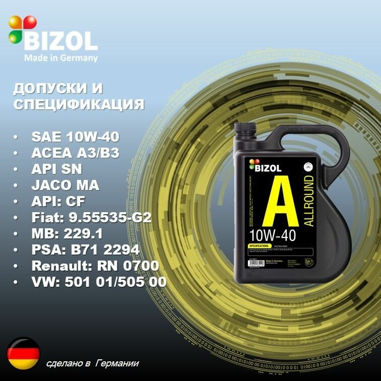 BIZOL BIZOL 83011 BIZOL НС-синт. мот.масло Allround 10W-40 SN A3B4 MA2 (5л) BIZOL 83011