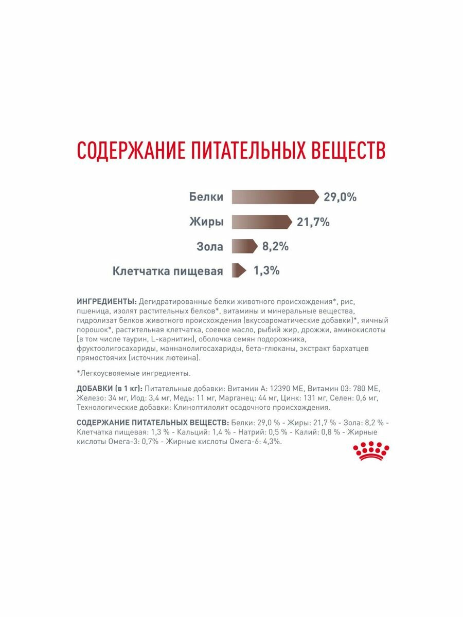 | Состав | рис, дегидратированные белки животного происхождения (птица), животные жиры, кукуруза, дегидратированные белки животного происхождения (свинина)*, пшеничная клейковина*, свекольный жом, гидролизат белков животного происхождения (вкусоароматические добавки), минеральные вещества, яичный порошок, соевое масло, рыбий жир, продукты переработки дрожжей, оболочки и семена подорожника (источник растительной слизи), фруктоолигосахариды (0,5 %), гидролизат дрожжей (источник мaннановых олигосахаридов (0,2 %) и бета-глюканов), экстракт бархатцев прямостоячих (источник лютеина) |