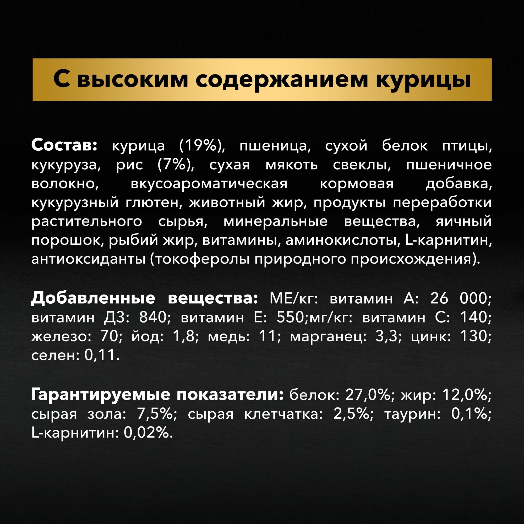 | Состав | обновленный: курица (19%), пшеница, сухой белок птицы, кукуруза, рис (7%), пшеничное волокно, вкусоароматическая кормовая добавка, сухая мякоть свеклы, кукурузный глютен, животный жир, пшеничный глютен, продукты переработки растительного сырья, минеральные вещества, яичный порошок, рыбий жир, витамины, аминокислоты, L-карнитин, антиоксиданты (токоферолы природного происхождения). прежний: сухой белок птицы, пшеница, кукуруза, курица (14%), рис (10%), пшеничное волокно, вкусоароматическая кормовая добавка, глютен, животный жир, сухая мякоть свеклы, минеральные вещества, рыбий жир, продукты переработки растительного сырья, витамины, антиоксиданты |