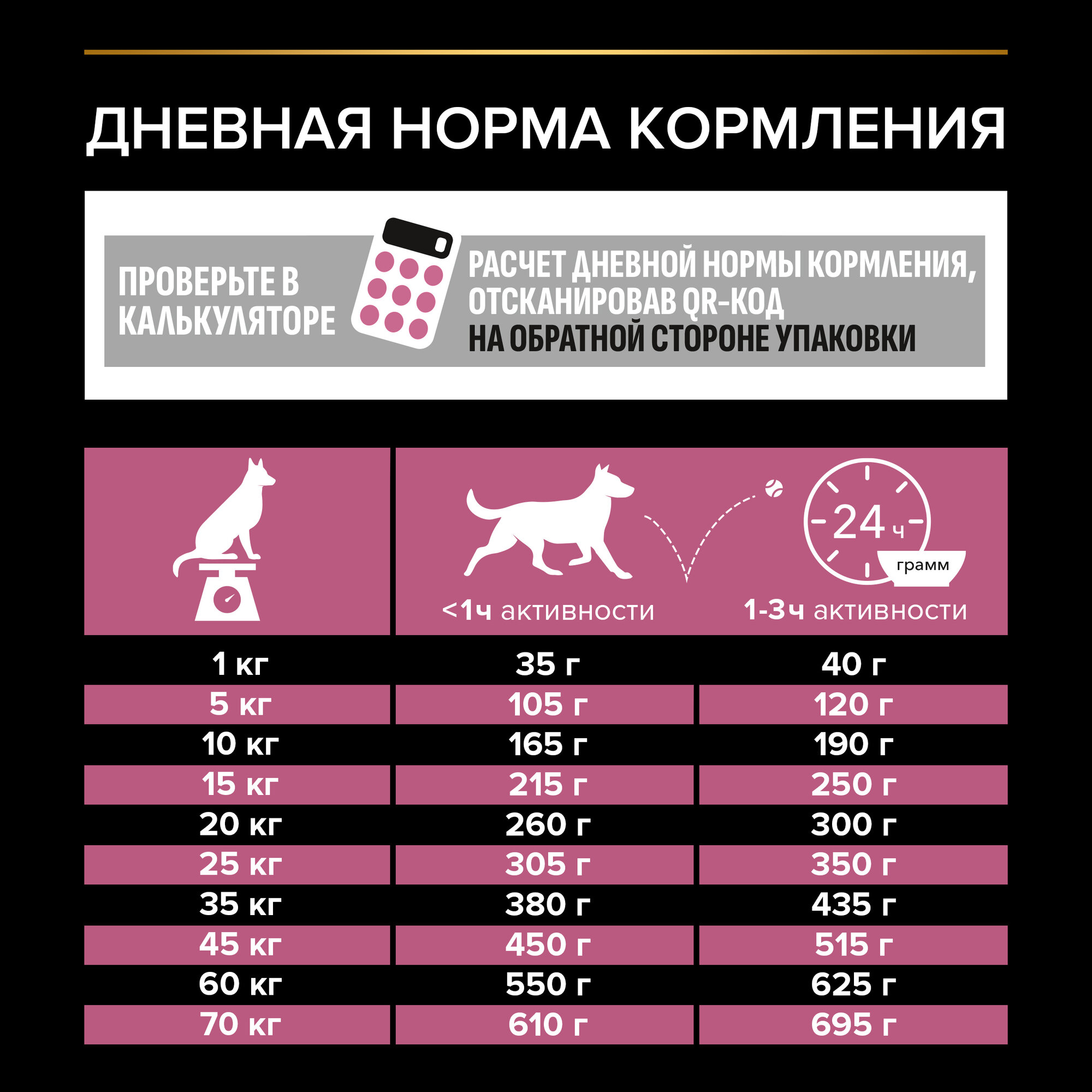 | Дополнительная информация | используйте таблицу для определения суточной нормы кормления вашей собаки; указанные нормы рекомендованы для поддержания собаки в оптимальной физической форме; меняйте суточную норму кормления в зависимости от уровня активности собаки, ее физических особенностей и индивидуальных потребностей; следите, чтобы у собаки всегда была чистая, свежая питьевая вода; для контроля здоровья вашей собаки обращайтесь в ветеринарную клинику на регулярной основе |