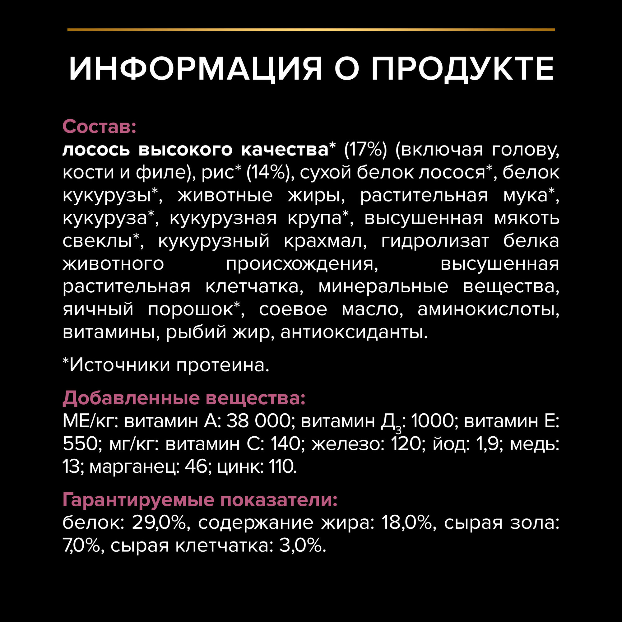 | Пищевая ценность | обновленная: белок: 26%, жир: 16%, сырая зола: 7,5%, сырая клетчатка: 2,5 прежняя: белок: 25% жир: 15% сырая зола: 7,5% сырая клетчатка: 3% |