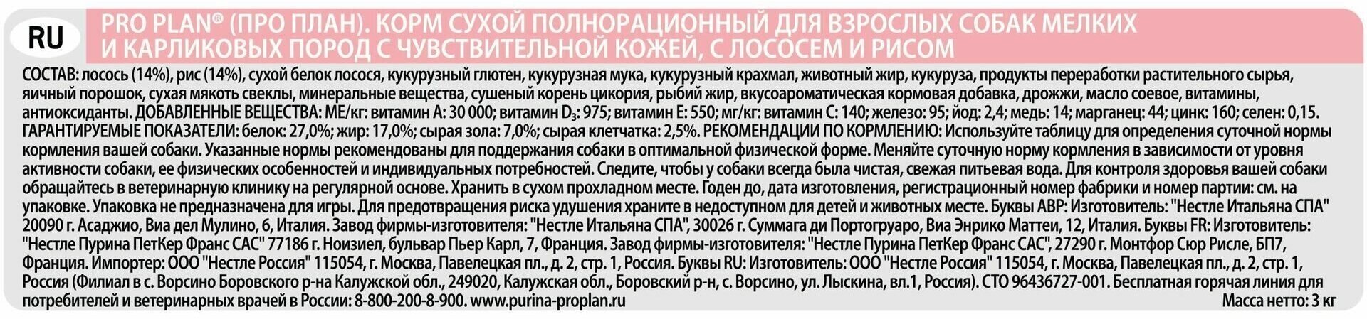 PRO PLAN Adult SmallandMini Sensitive Skin корм для взрослых собак мелких и карликовых пород с чувствительной кожей, с лососем 3кг
