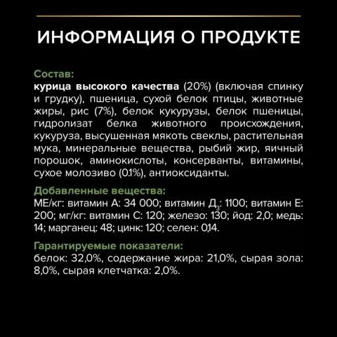 | Состав | курица (20%), пшеница, сухой белок птицы, животный жир, рис (7%), кукурузный глютен, пшеничный глютен, вкусоароматическая кормовая добавка, кукуруза, сухая мякоть свеклы, продукты переработки растительного сырья, минеральные вещества, яичный порошок, рыбий жир, консерванты, витамины, молозиво (0,1%), антиоксиданты (токоферолы природного происхождения) |