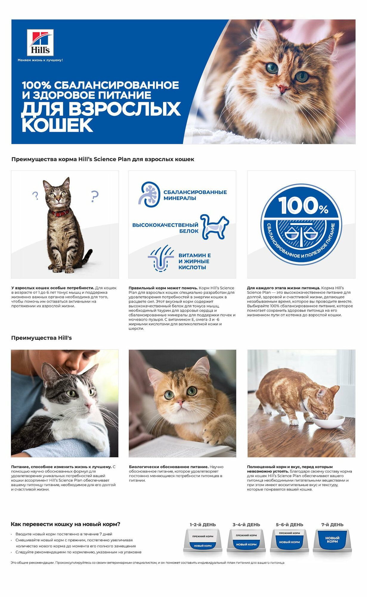 | Дополнительная информация | не рекомендуется для котят и беременных или кормящих кошек; во время беременности или кормления нужно сменить корм на Hill's Science Plan для котят влажный или сухой корм; без искусственных ароматизаторов, красителей и консервантов |