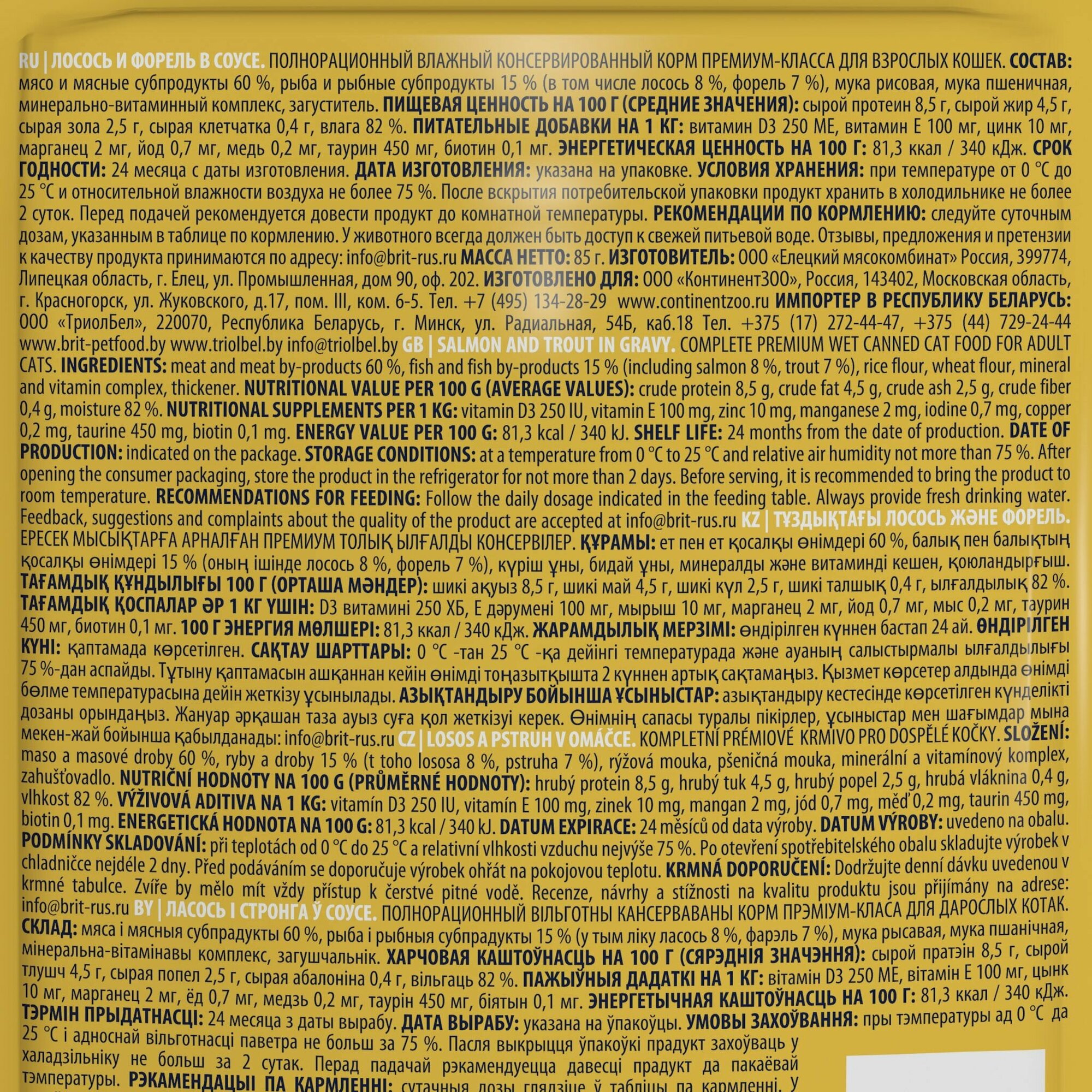 СохранитьВлажный корм для кошек, кусочки в соусе Лосось и Форель 85 гр, 14 шт, Brit Premium интересное: