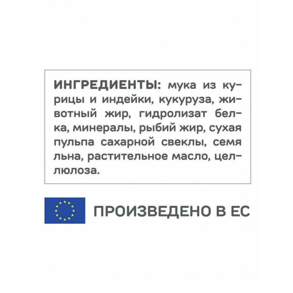 | Состав | курица 29%, общее содержание мяса домашней птицы 45%; мука из курицы и индейки, кукуруза, животный жир, гидролизат белка, минералы, рыбий жир, сухая пульпа сахарной свеклы, семя льна, растительное масло, целлюлоза |