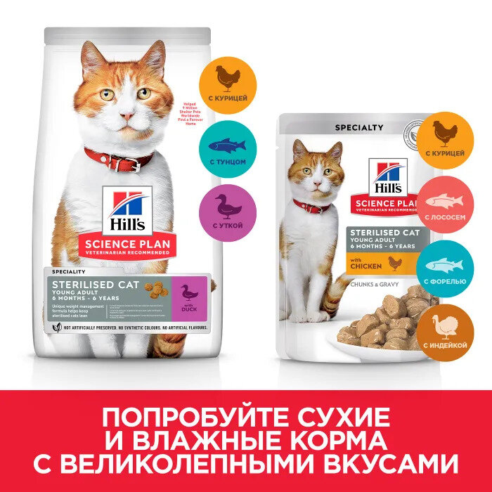| Дополнительная информация | низкое содержание жира и высокий уровень L-лизина для поддержания энергичности; рекомендуется для стерилизованных кошек 6 месяцев-6 лет. Не рекомендуется для котят младше 6 месяцев, беременных или кормящих кошек.Во время беременности или кормления нужно сменить корм на Hill's Science Plan для котят влажный или сухой корм. Без искусственных ароматизаторов, красителей и консервантов. |