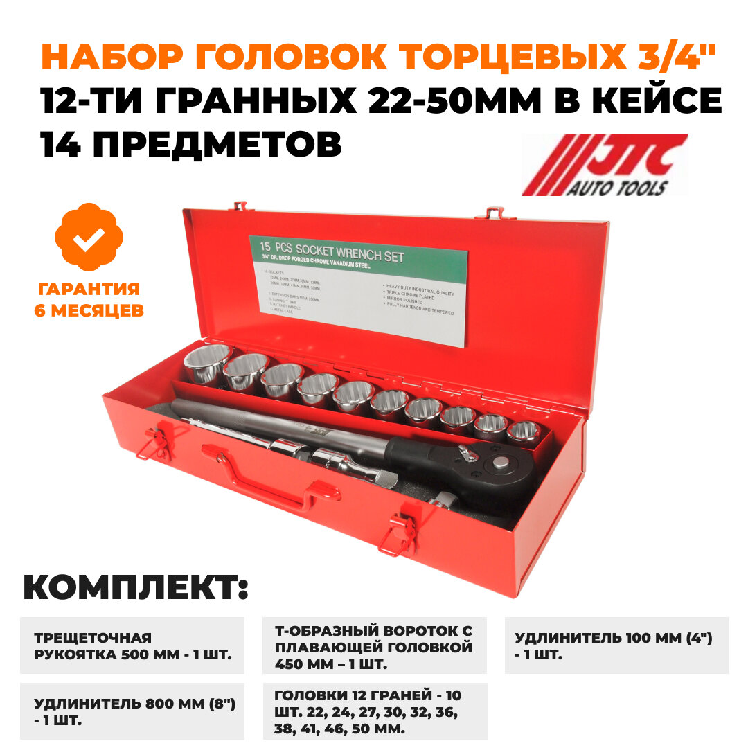 Набор 12-гранных торцевых головок 3/4, 22-50мм, 14шт в кейсе JTC-T615M