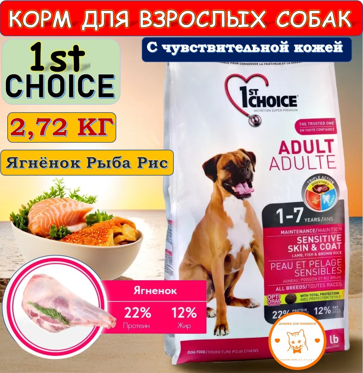 1ST CHOICE DOG ADULT ALL BREEDS SENSITIVE SKIN & COAT для взрослых собак всех пород при аллергии с ягненком, рыбой и рисом (0,35 кг)