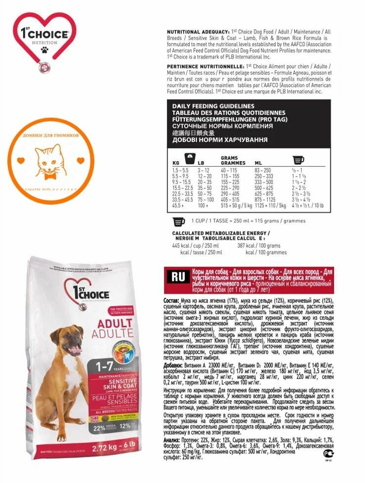 1st Choice-сухой корм для собак для здоровья кожи и шерсти, ягненок, рыба, с коричневым рисом 1 уп. х 1 шт. х 2.72 кг