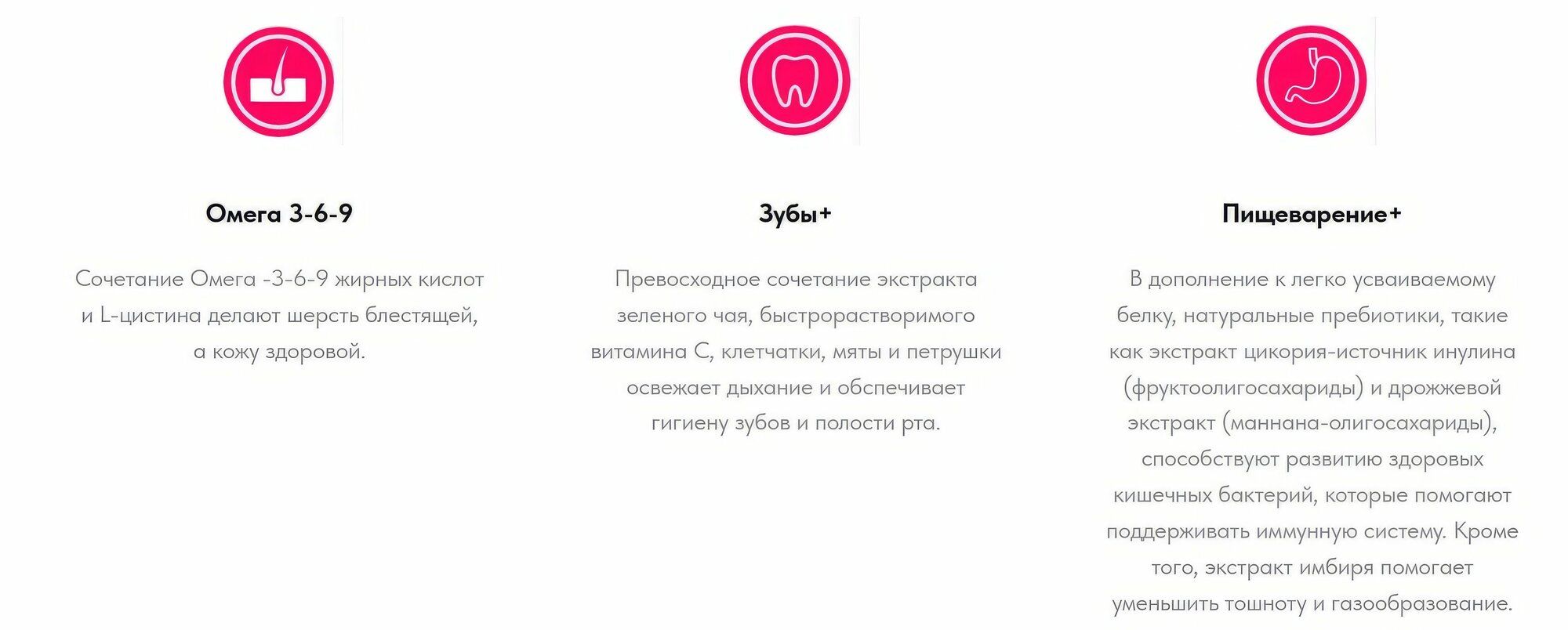 | Особые потребности | при чувствительном пищеварении / для активных животных / для здоровья костей и суставов / при склонности к избыточному весу / для здоровья кожи и блеска шерсти / гипоаллергенный |