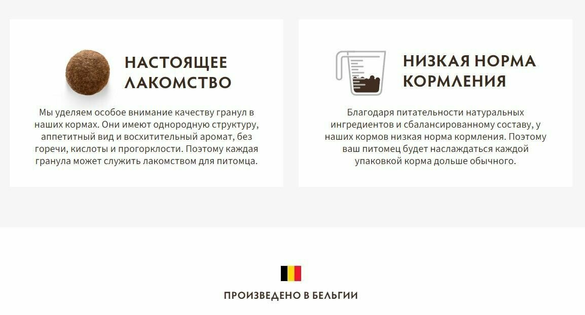 | Дополнительная информация | размер гранулы: 7 мм; корм содержит: комплекс натуральных антиоксидантов (экстракт розмарина, грейпфрута, апельсина, куркумы, сизигиума): 300 мг/кг; аминокислоты: таурин: 1.000 мг/кг; страна производства: Бельгия |