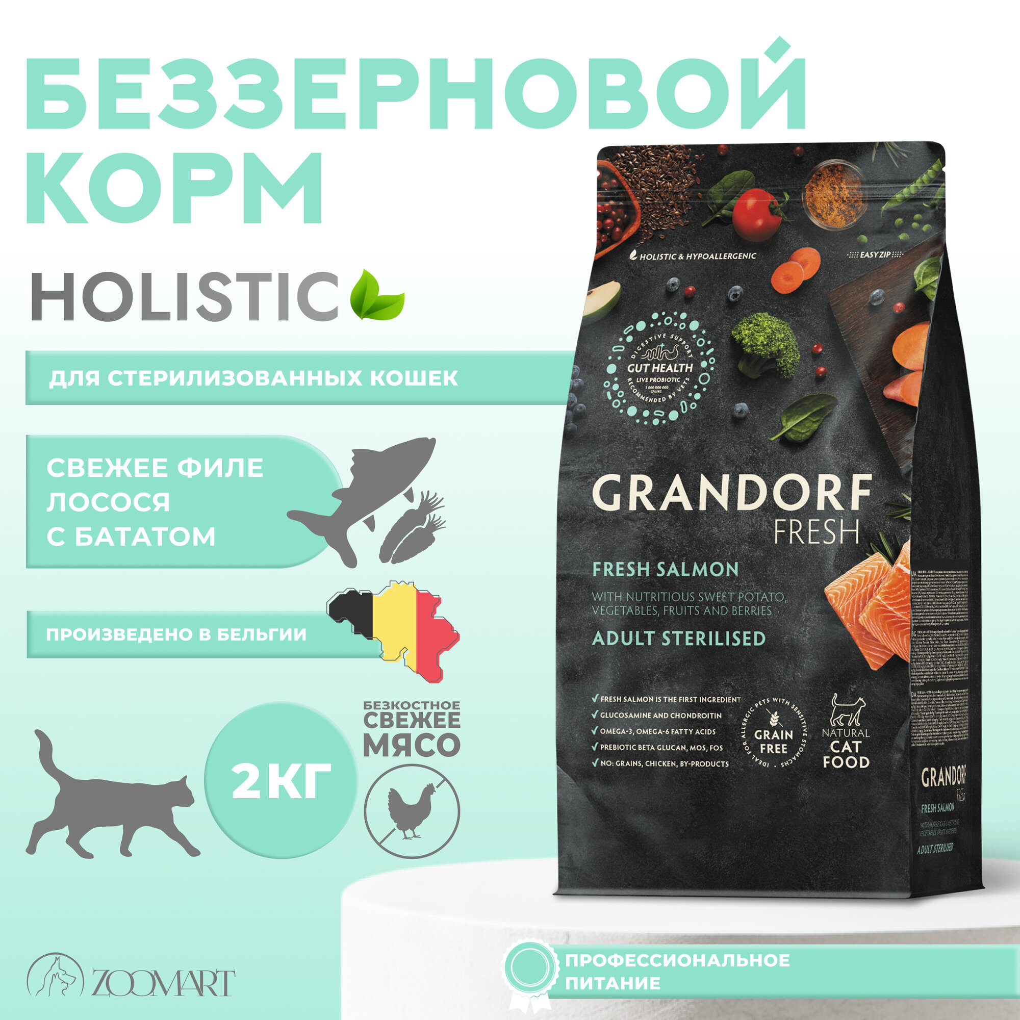 Купить Корм сухой Grandorf Fresh , беззерновой с живыми пробиотиками, свежее филе лосося с бататом для стерилизованных кошек, 2 кг