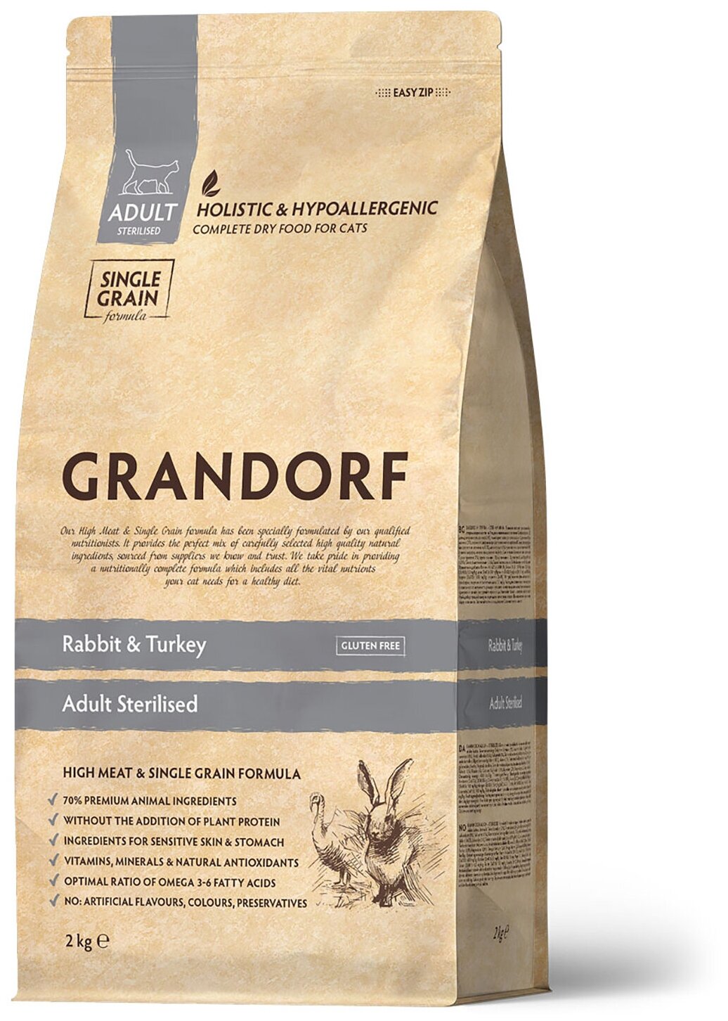 Корм для кошек GRANDORF Кролик с индейкой Sterilised 2кг. Для взрослых стерилизованных или пожилых кошек от 1 года. С пробиотиками, низкозерновой.