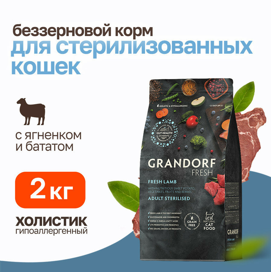 Сухой беззерновой корм Grandorf Fresh 2кг свежее мясо ягненка с бататом, с живыми пробиотиками для взрослых стерилизованных кошек с чувствительным пищеварением или склонных к аллергии