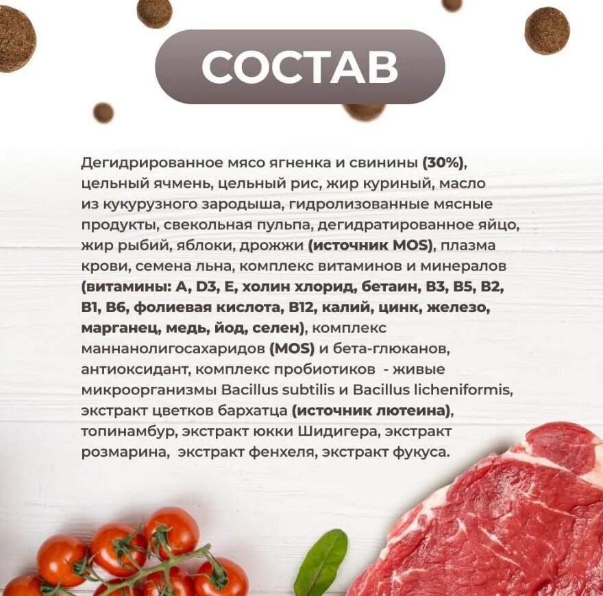 | Состав | дегидрированное мясо ягненка и свинины, кукуруза, рис, гидролизованный белок, рыбий и куриный жир, гидролизованная печень, кукурузные рыльца, сушеная мякоть свеклы, витаминно-минеральный премикс (витамины: А, Д3, Е, холин хлорид, бетаин, В3, В5, В2, В1, В6, фолиевая кислота, В12, калий, цинк, железо, марганец, медь, йод, селен), дрожжи - источник мананн-олигосахаридов (MOS), яблоко сушеное, дегидратированное яйцо, регулятор кислотности, пробиотик - живые микроорганизмы Bacillus subtilis и Bacillus licheniformis, инулин - фруктоолигосахарид (FOS), фенхель, юкка Шидигера, фукус, антиоксиданты (витамин Е и экстракт розмарина) |