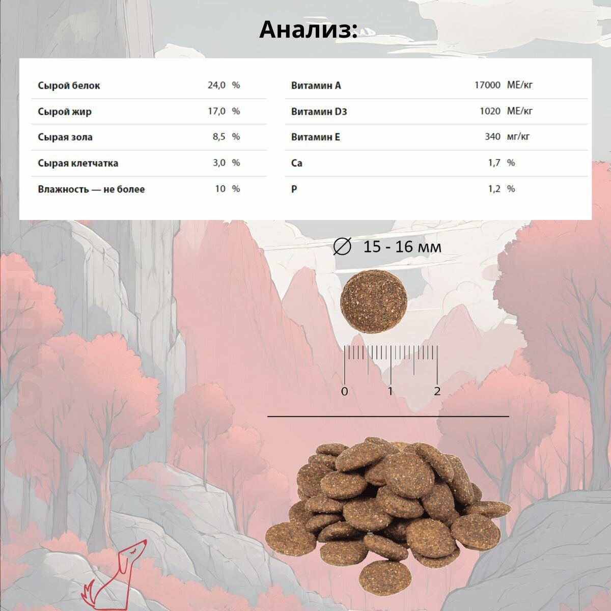 | Состав | дегидрированное мясо ягненка и свинины, кукуруза, рис, гидролизованный белок, рыбий и куриный жир, гидролизованная печень, кукурузные рыльца, сушеная мякоть свеклы, витаминно-минеральный премикс (витамины: А, Д3, Е, холин хлорид, бетаин, В3, В5, В2, В1, В6, фолиевая кислота, В12, калий, цинк, железо, марганец, медь, йод, селен), дрожжи - источник мананн-олигосахаридов (MOS), яблоко сушеное, дегидратированное яйцо, регулятор кислотности, пробиотик - живые микроорганизмы Bacillus subtilis и Bacillus licheniformis, инулин - фруктоолигосахарид (FOS), фенхель, юкка Шидигера, фукус, антиоксиданты (витамин Е и экстракт розмарина) |