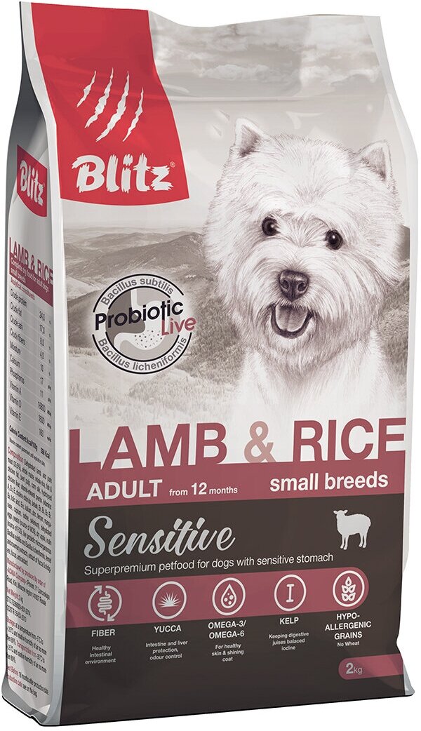 Сухой корм для щенков Blitz Sensitive, при чувствительном пищеварении, ягненок, с рисом 2 кг