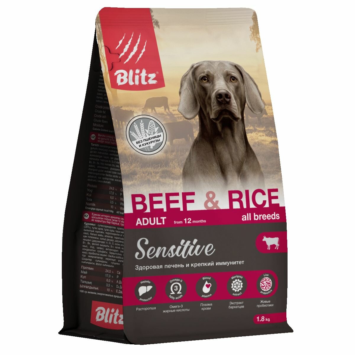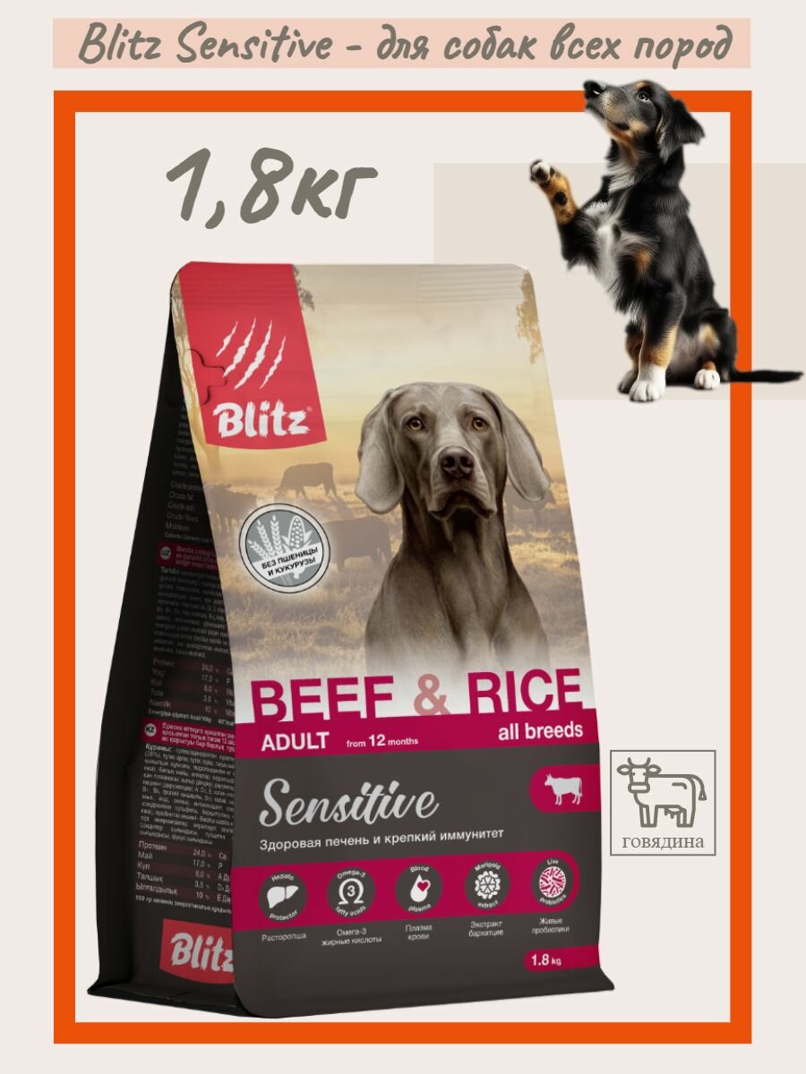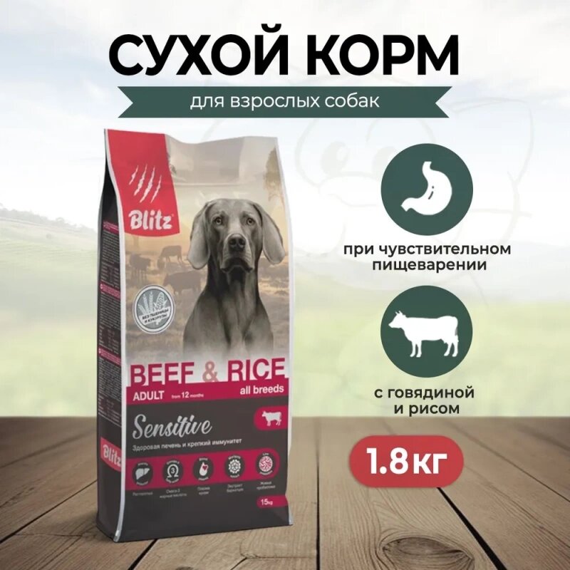 Корм сухой для собак BLITZ Adult Sensitive с говядиной и рисом, 1,8 кг
