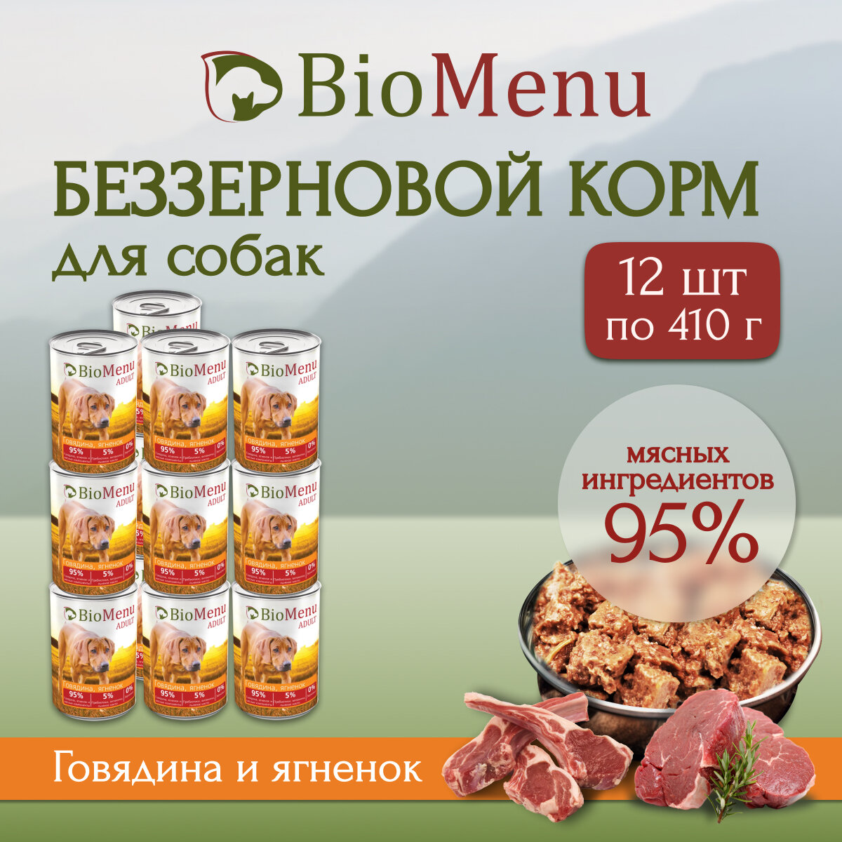 BioMenu ADULT Консервы для собак Говядина/Ягненок 95%-мясо 410г х 12 шт