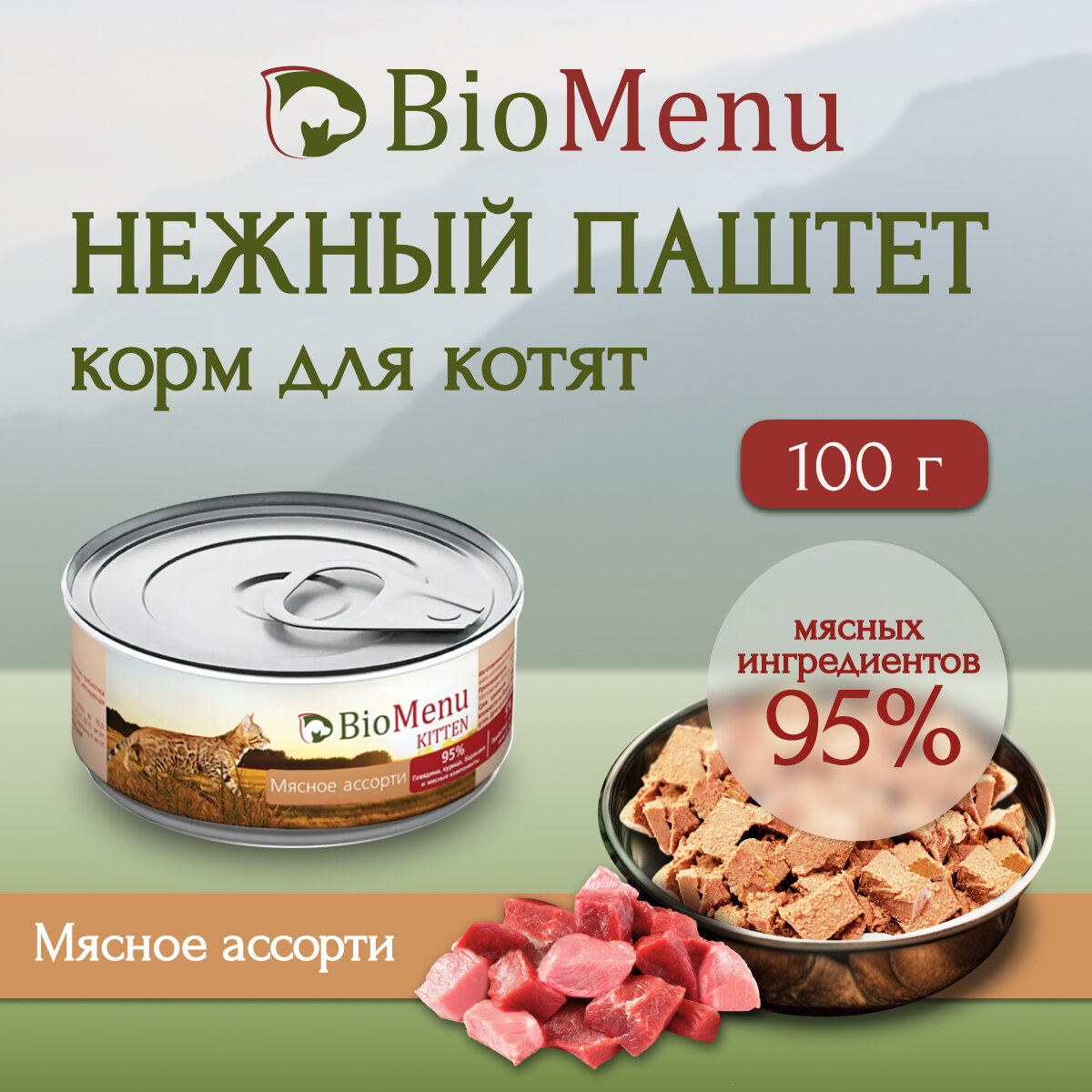 Консервы для котят BioMenu Kitten, мясной паштет 95% - мясо, мясное ассорти 100 г