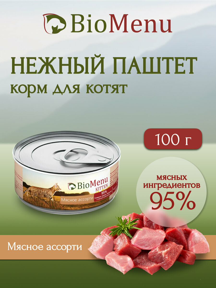 BioMenu KITTEN Консервы д/котят паштет Мясное ассорти 95%-мясо 100гр x 24 шт
