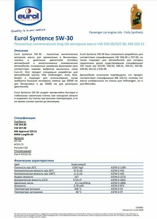Моторное масло EUROL SYNTENCE 5W-30 VW 504/507 синт 1Л E1000621L