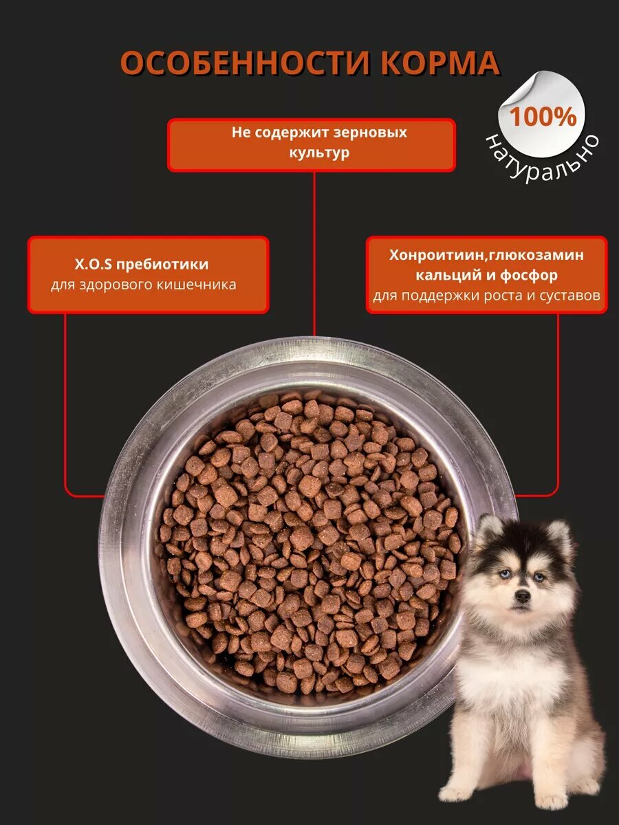 | Плюсы: | Питательный, мелкие частички корма, удобно для щенков |