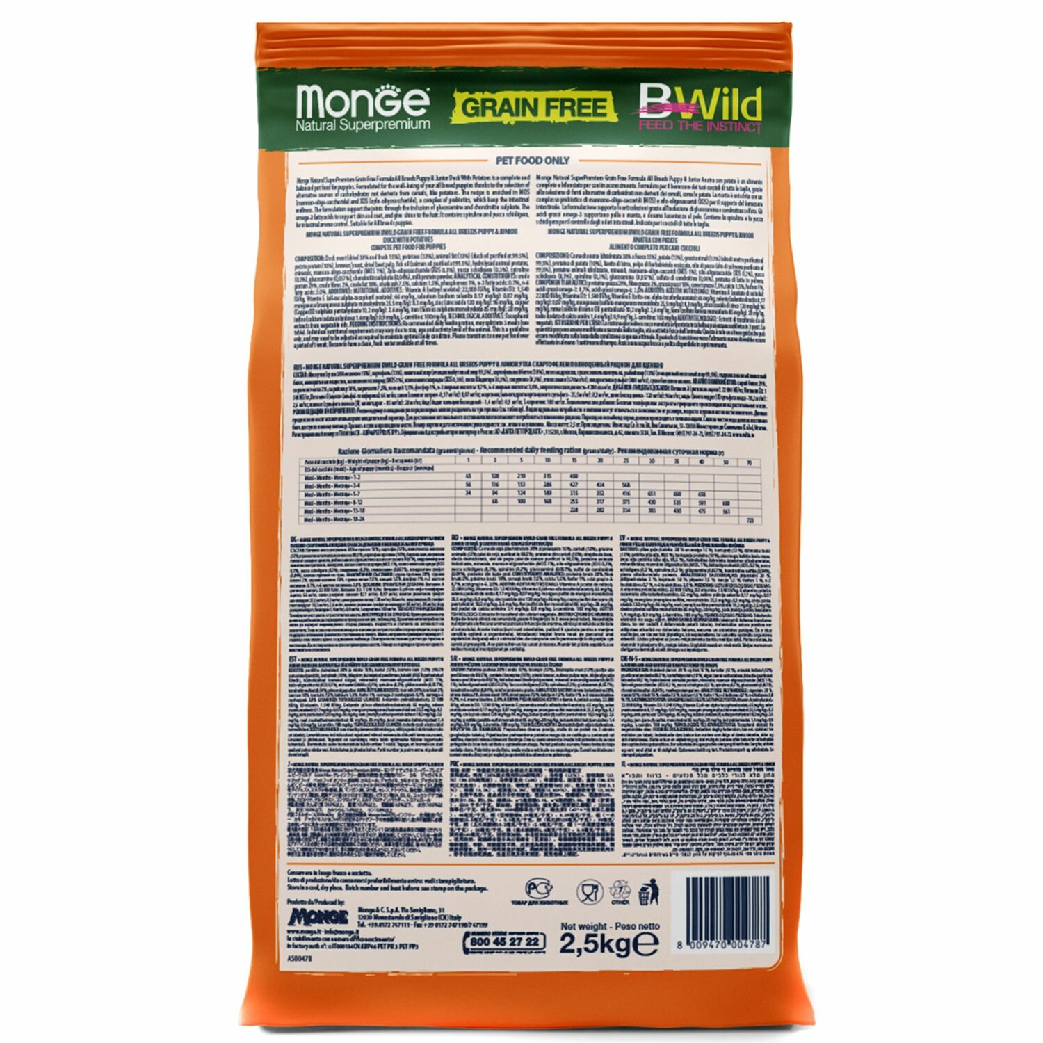 Купить Сухой корм для щенков Monge, беззерновой, Утка с картофелем 2,5 кг