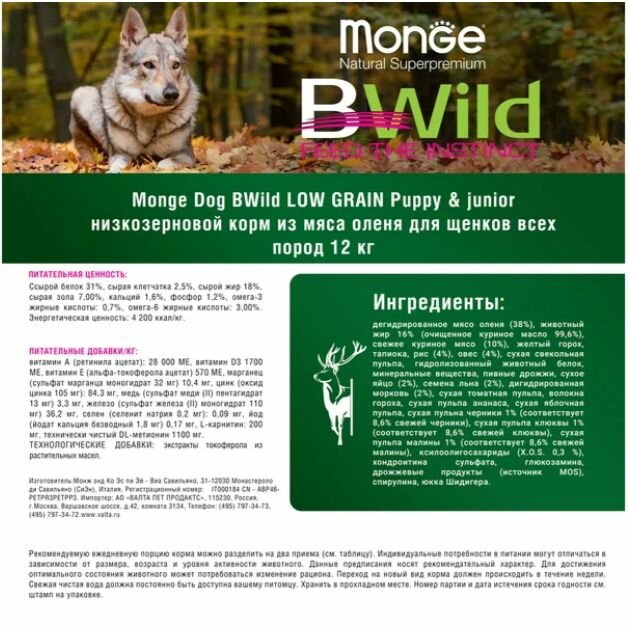 Купить Сухой корм для щенков Monge, из мяса оленя 12кг