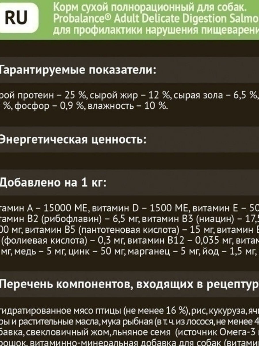 | Состав | дегидратированное мясо (16 %), ячмень, отруби пшеничные, протеины растительного происхождения, рис (не менее 6 %), животные жиры и растительные масла, мука рыбная (в т.ч.лосось не менее 4 %), овес, свекловичный жом, натуральные вкусоароматические добавки, льняное семя, яичный порошок, витаминно-минеральная добавка для собак (витамины А, D3, Е, В1, В2, В3, В4, В5, В6, В9 (фолиевая кислота), В12, Н (биотин), железо, медь, цинк, марганец, йод, селен), жир рыбий. |