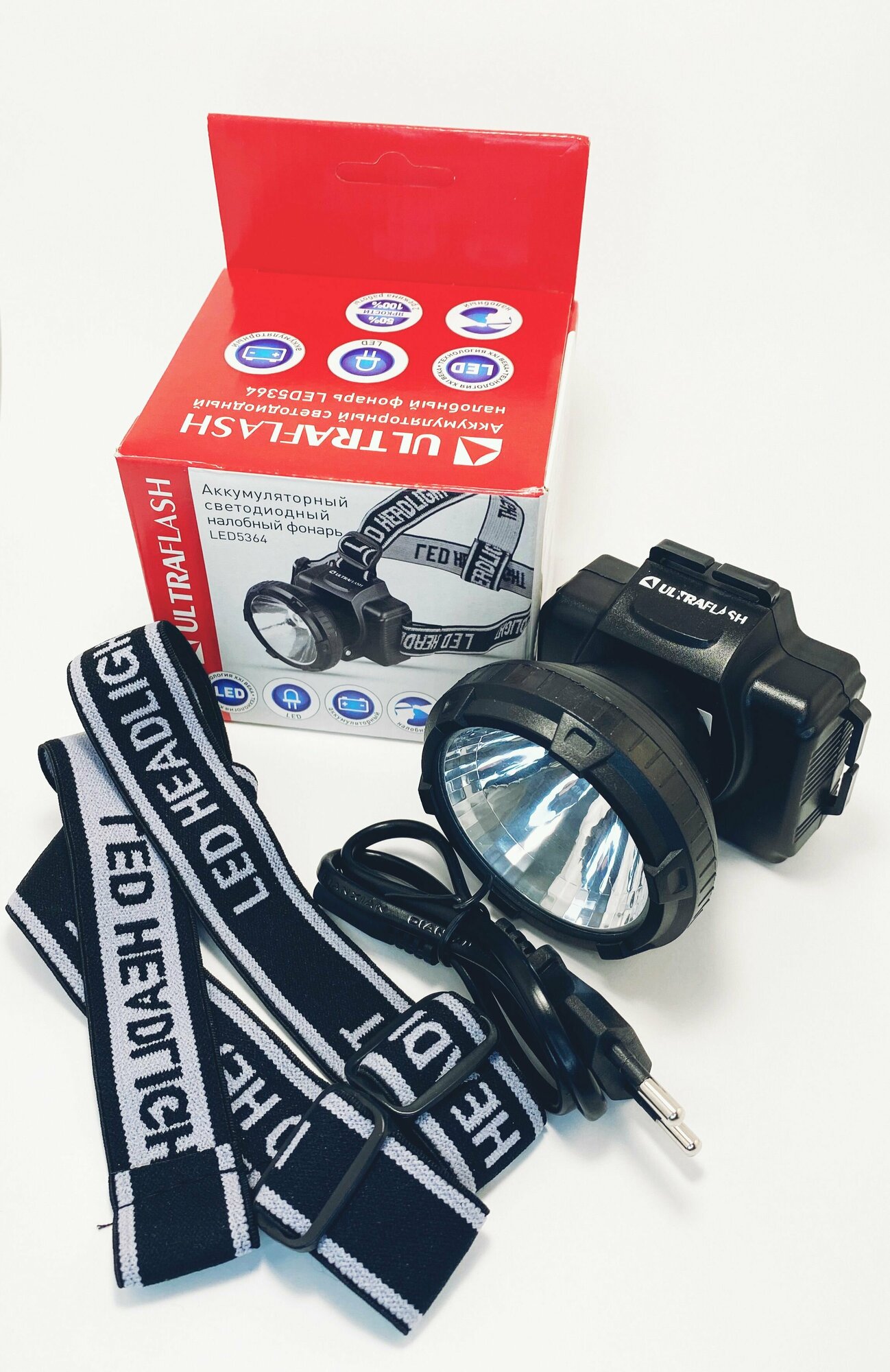Фонарь налобный аккумуляторный LED 5364 (220В LED 2 режима; черн.), ULTRAFLASH 11258 (1 шт.)