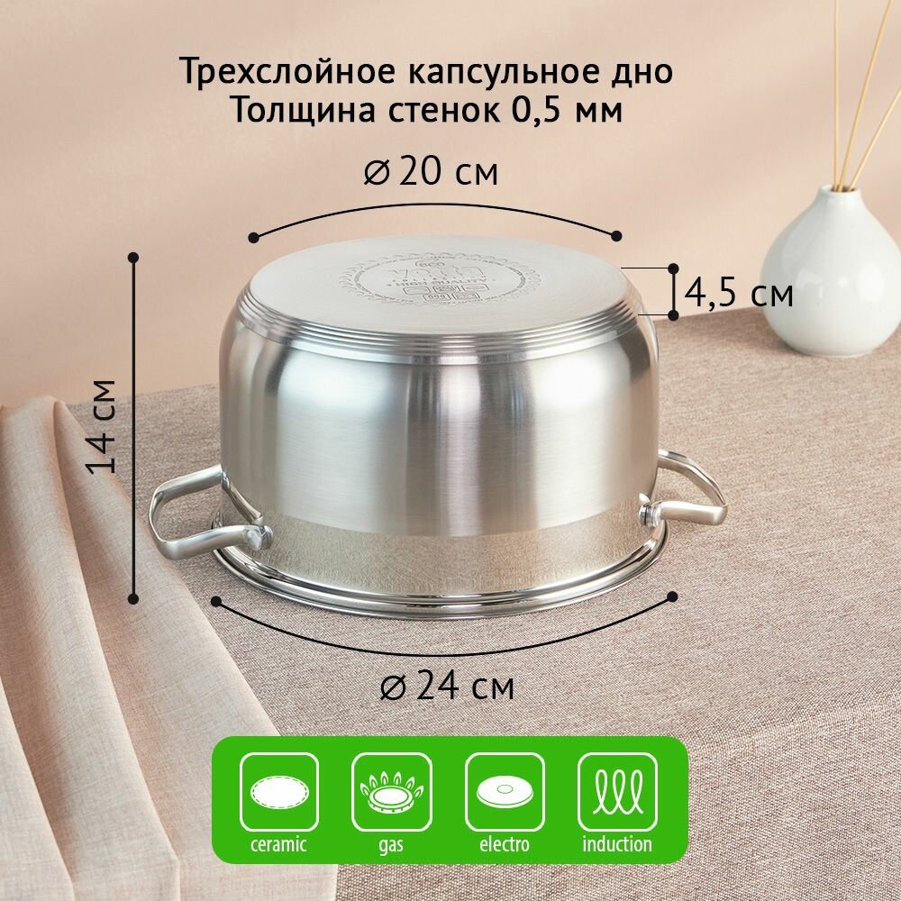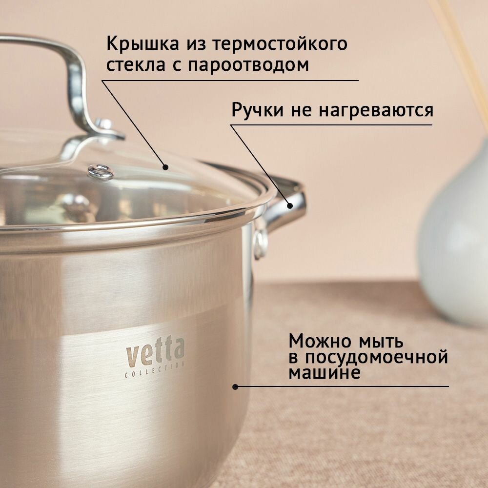 Кастрюля 3,5 л со стеклянной крышкой, нержавеющая сталь Vetta, индукция